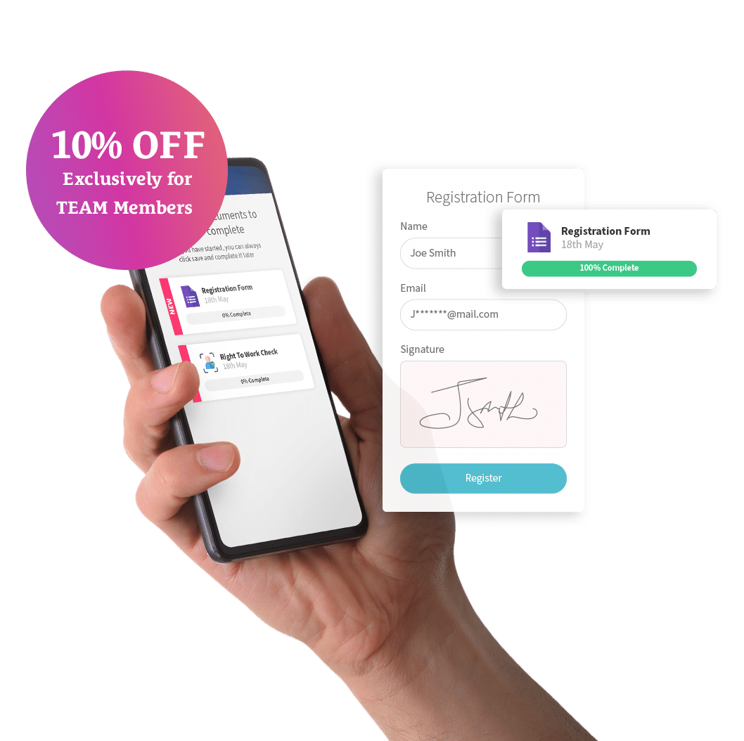 Allow candidates to e-Sign registration and onboarding documents directly from their smartphone, anywhere, anytime for automatic compliance.